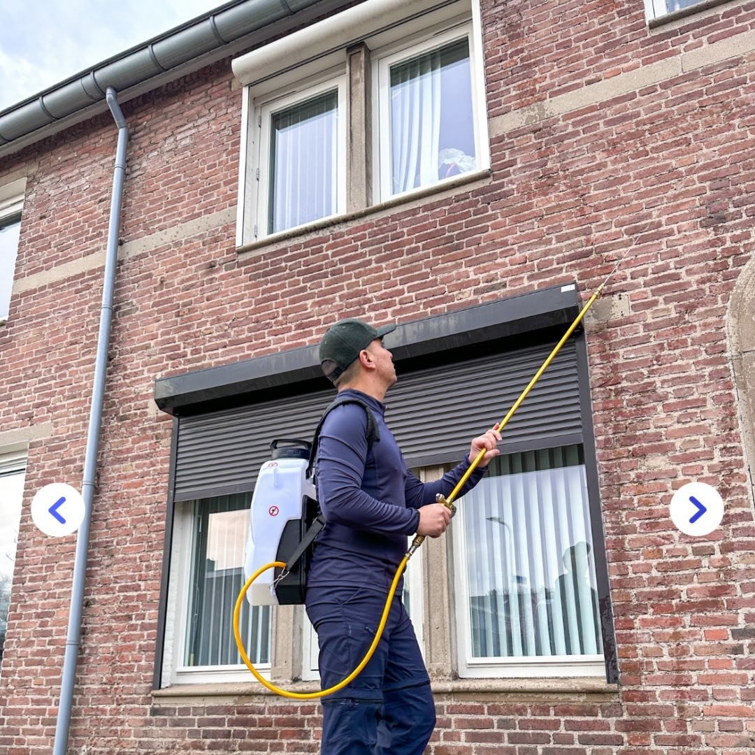 We beginnen met een zorgvuldige inspectie om te bepalen waar de meeste spinnen, insecten en hun nesten zich bevinden. Deze gebieden maken we vervolgens grondig schoon. Met een ragebol maken we ramen, overkappingen, kozijnen en gevels tot 7 meter* hoogte vrij van webben en vuil.